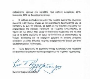 ε. Ο καθένας αντιλαμβάνεται λοιπόν τον τεράστιο αγώνα που έδωσα και δίνω από το 2010 μέχρι σήμερα με την ακατάπαυστη δραστηριότητά μου να διατηρήσω εν ζωή την εταιρεία. Σε σχέση με τις τελευταίες δηλώσεις των μικρομετόχων της εταιρείας Παναγιώτη και Γεωργίου Αγγελοπούλου, (ο πρώτος εκ των οποίων ήταν μέλος του διοικητικού συμβουλίου από το 2002 έως και το 2017), σημειώνω ότι έχουν την δυνατότητα να ακολουθήσουν τις νόμιμες διαδικασίες και να εισφέρουν χρήματα σε αύξηση μετοχικού κεφαλαίου. Οι λοιπές δηλώσεις τους που αναφέρονται στην σύζυγό μου είναι ψευδέστατες και εκ του πονηρού.