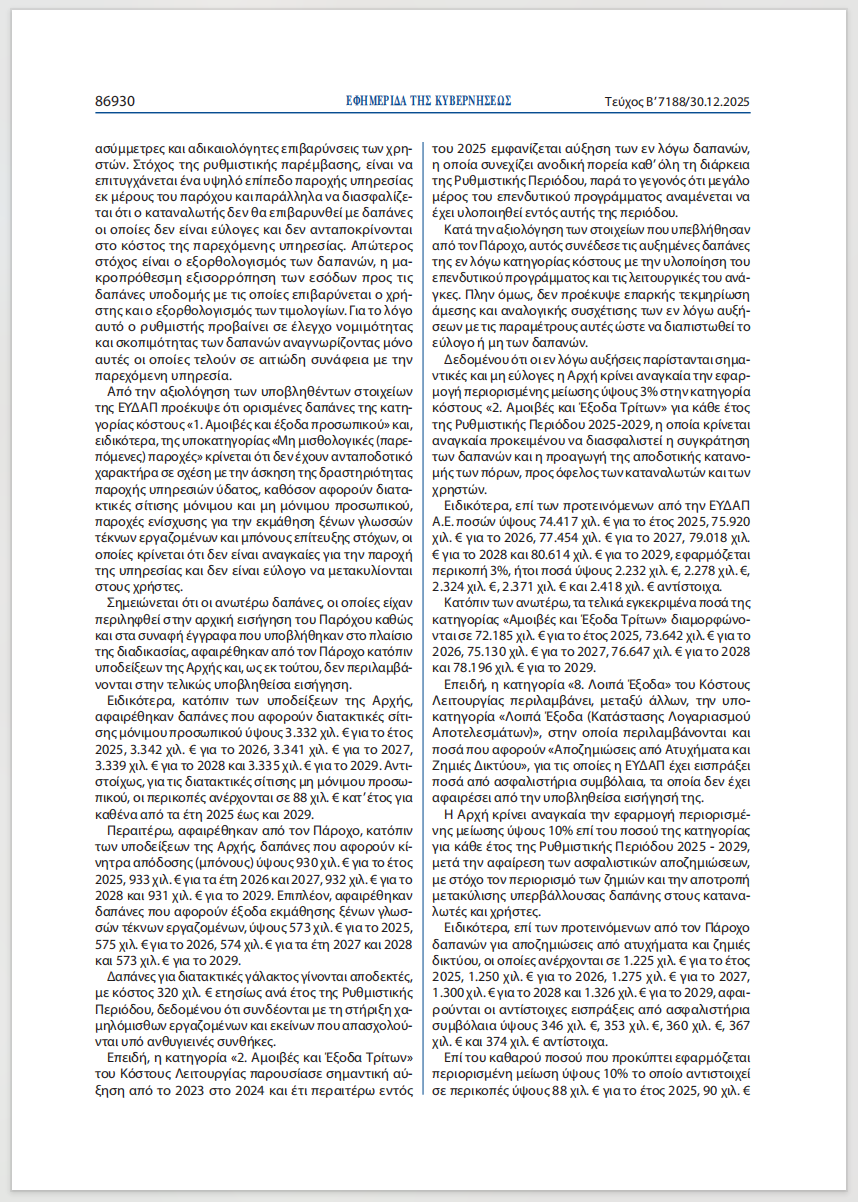 διαίτερα αυστηρή ήταν η ΡΑΑΕΥ και στις αμοιβές και δαπάνες τρίτων, οι οποίες εμφάνιζαν διαρκή αύξηση χωρίς επαρκή τεκμηρίωση. Για τον λόγο αυτό, αποφάσισε οριζόντια μείωσης για όλα τα έτη (2025-2029), με την αιτιολογία της έλλειψης άμεσης και αναλογικής σύνδεσης με το επενδυτικό πρόγραμμα. Μόνο από το «κούρεμα» αυτό οι καταναλωτές γλιτώνουν… 11 εκ. ευρώ!