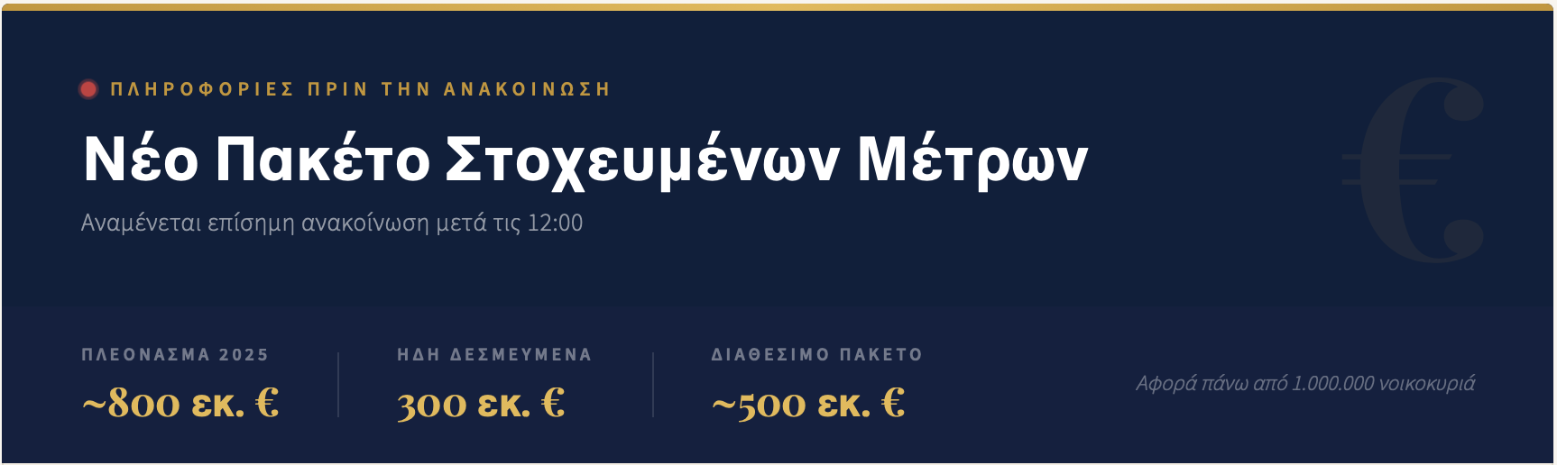 Ο πρωθυπουργός Κυριάκος Μητσοτάκης θα παρουσιάσει τις βασικές κατευθύνσεις λίγο μετά τις 12 το μεσημέρι, αμέσως μετά τη δημοσιοποίηση των στοιχείων για το πλεόνασμα, ενώ στη συνέχεια οι αρμόδιοι υπουργοί θα προχωρήσουν στην εξειδίκευση. Με το πλεόνασμα του 2025 να διαμορφώνεται, σύμφωνα με πληροφορίες, κοντά στα 800 εκατ. ευρώ, η κυβέρνηση ετοιμάζεται να ανακοινώσει ένα πακέτο μέτρων για τη στήριξη των πιο ευάλωτων, χωρίς να ξεφύγει ο προϋπολογισμός. Από αυτά, περίπου 300 εκατ. ευρώ έχουν ήδη δεσμευτεί για τα μέτρα που ήδη υλοποιούνται, αφήνοντας ένα διαθέσιμο «πακέτο» γύρω στα 500 εκατ. ευρώ για νέες παρεμβάσεις.