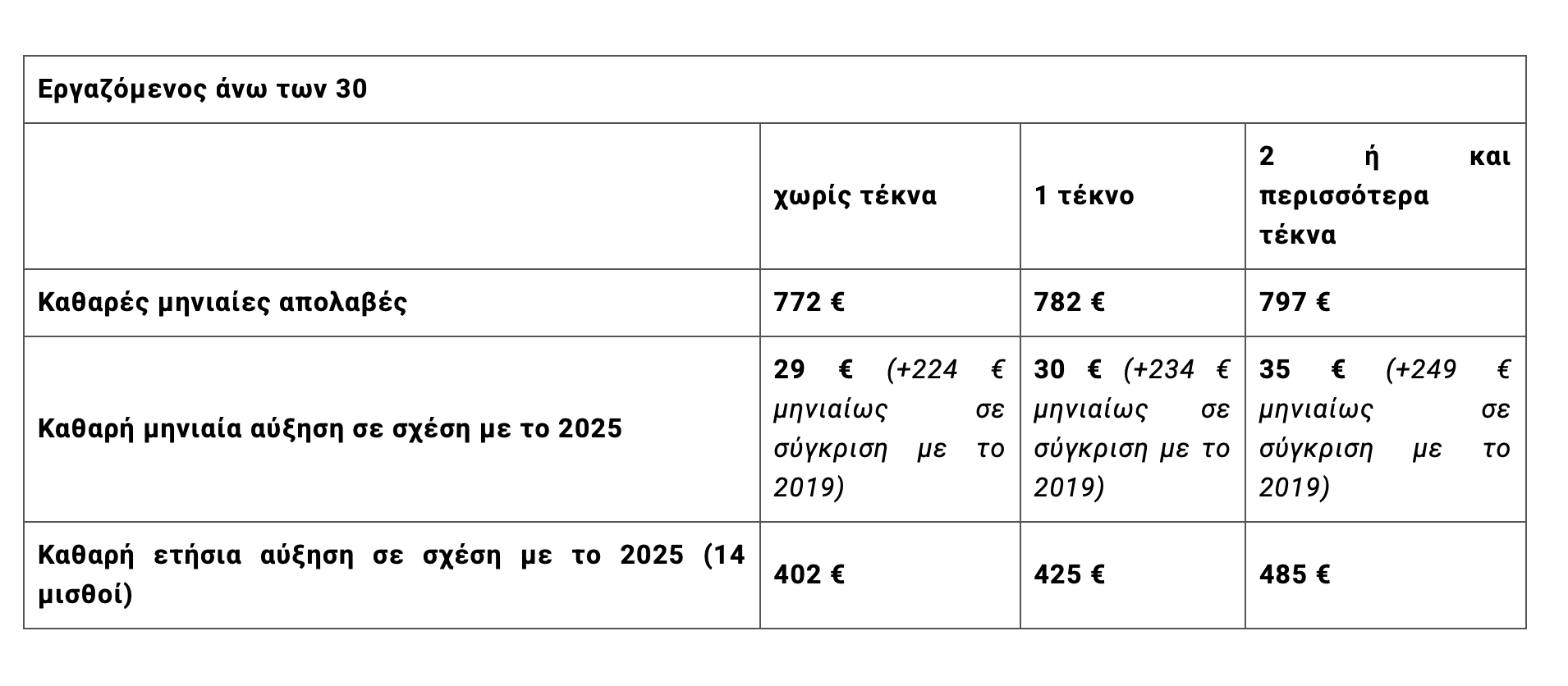 Η νέα παρέμβαση έρχεται να προστεθεί σε μια διαδοχική πορεία αυξήσεων των τελευταίων ετών. Σύμφωνα με τα στοιχεία που επικαλείται το Υπουργείο Εργασίας, από το 2019 έως σήμερα η σωρευτική αύξηση του κατώτατου μισθού φθάνει τα 270 ευρώ τον μήνα, ή 3.780 ευρώ σε ετήσια βάση, αντιστοιχώντας σε συνολική αύξηση 41,54%. Με απλά λόγια, ο βασικός μισθός έχει ενισχυθεί σημαντικά μέσα σε μία επταετία, με την κυβέρνηση να διατηρεί ως επόμενο στόχο το επίπεδο των 950 ευρώ έως το 2027.