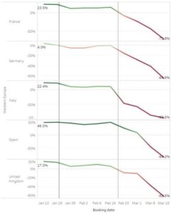 Η ανάλυση των ταξιδιωτικών σχεδίων των καταναλωτών δίνει κάποια αίσθηση της βαρύτητας της κατάστασης και δεν εκπλήσσει το γεγονός ότι οι παγκόσμιες κρατήσεις πτήσεων στην Ευρώπη έχουν μειωθεί δραστικά, με την Ιταλία να σημειώνει πτώση κατά 94% στις κρατήσεις πτήσεων την περασμένη εβδομάδα. Κι αυτό είναι λογικό, λαμβάνοντας υπόψη τους περιορισμούς ταξιδιού που ισχύουν σήμερα. Επίσης, το Ηνωμένο Βασίλειο παρουσίασε πτώση κατά 63% στις κρατήσεις πτήσεων την περασμένη εβδομάδα, από 37% την αμέσως προηγούμενη εβδομάδα. Αναμένετε δε, η πτωτική τάση να αυξηθεί, λόγω των αυξημένων περιορισμών στο Ηνωμένο Βασίλειο.
