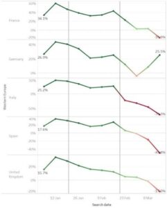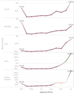 Οι παγκόσμιες αναζητήσεις πτήσεων στην Ευρώπη ακολούθησαν παρόμοια πτωτική τάση, ενώ η Γαλλία και η Γερμανία παρουσίαζαν μια λιγότερο απαισιόδοξη άποψη από χώρες όπως η Ιταλία και η Ισπανία.