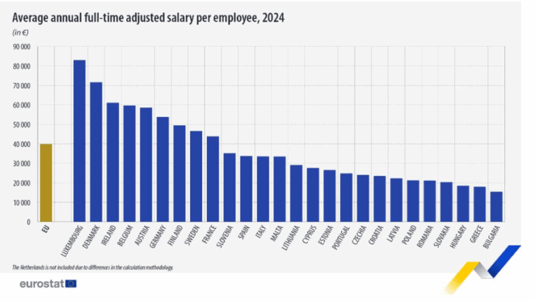 Οι υψηλότεροι μέσοι μισθοί στην ΕΕ καταγράφηκαν στο Λουξεμβούργο (83.000 ευρώ), ακολουθούμενο από τη Δανία (71.600 ευρώ) και την Ιρλανδία (61.100 ευρώ).