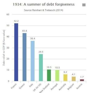 Ως μέρος αυτής της διαδικασίας, ένα μεγάλο μέρος των χρεών των περισσότερων χωρών διεγράφησαν. Από το 1932 έως το 1939, ο μέσος όρος μείωσης του χρέους ανήλθε σε 19% του ΑΕΠ για τις προηγμένες οικονομίες, σύμφωνα με τους οικονομολόγους Carmen Reinhart και Christoph Tresbech. Για τη Γαλλία και την Ελλάδα το ποσοστό έφτασε το 50% και το 40% του ΑΕΠ αντίστοιχα.