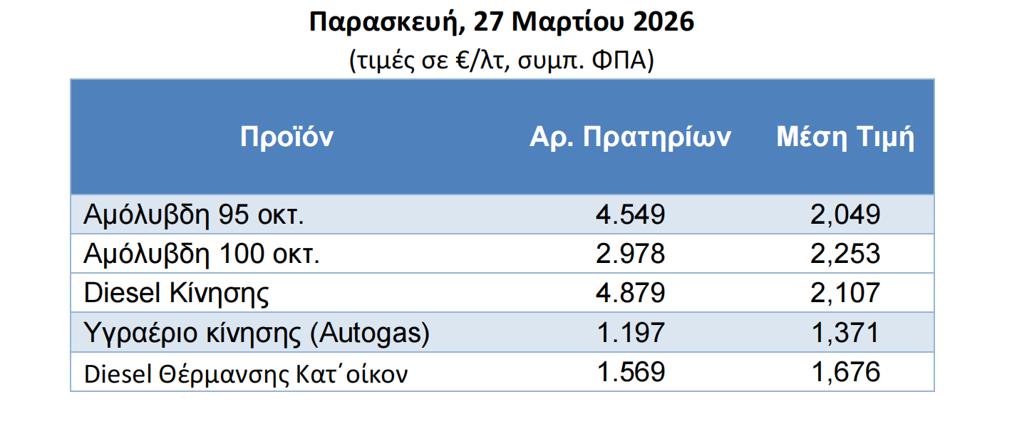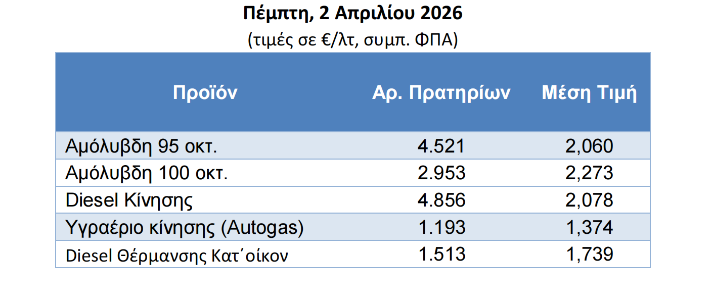 Τα τελευταία επίσημα στοιχεία της ΔΙ.Μ.Ε.Α. δείχνουν ότι η μέση πανελλαδική τιμή της αμόλυβδης 95 οκτανίων διαμορφώθηκε στα 2,060 ευρώ το λίτρο στις 2 Απριλίου, από 2,049 ευρώ στις 27 Μαρτίου, καταγράφοντας νέα άνοδο μέσα σε λίγες ημέρες. Την ίδια ώρα, το diesel κίνησης διαμορφώθηκε στα 2,078 ευρώ το λίτρο, έναντι 2,107 ευρώ μία εβδομάδα νωρίτερα, παραμένοντας πάντως σε πολύ υψηλό επίπεδο για νοικοκυριά και επαγγελματίες. Το υγραέριο κίνησης κινείται στο 1,374 ευρώ, ενώ το πετρέλαιο θέρμανσης έχει ανέβει στο 1,739 ευρώ το λίτρο από 1,676 ευρώ, εξέλιξη που δείχνει ότι το ενεργειακό κόστος παραμένει συνολικά πιεσμένο.