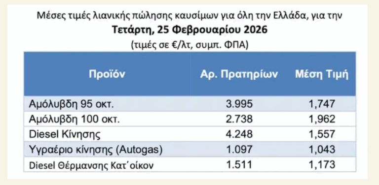 - Στο πετρέλαιο κίνησης (Diesel): Το diesel κινείται επίσης ανοδικά, με μέση τιμή περίπου 1,557 ευρώ/λίτρο, αυξημένη σε σχέση με δύο μήνες πριν.