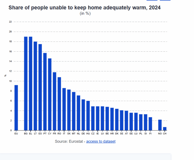 Στην Ελλάδα, το ποσοστό αυτό είναι 19%, και πάλι από τα υψηλότερα στην Ένωση, μαζί με τη Βουλγαρία. Σε μια χώρα με ψυχρτούς χειμώνες σε μεγάλο τμήμα της επικράτειας και γηρασμένο κτιριακό απόθεμα, το στοιχείο αυτό αναδεικνύει την ένταση της ενεργειακής φτώχειας.
