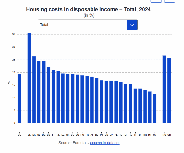 Παρ’ όλα αυτά, η στεγαστική επιβάρυνση των ελληνικών νοικοκυριών παραμένει η υψηλότερη στην ΕΕ, γεγονός που φωτίζει το χάσμα ανάμεσα στο κόστος ζωής και τα εισοδήματα.