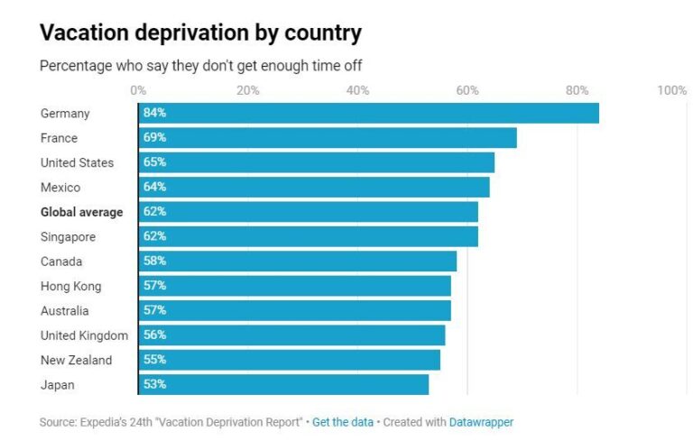 Παρόλα αυτά, το 84% των Γερμανών και το 69% των Γάλλων, που ερωτήθηκαν από την Expedia, δήλωσαν ότι αισθάνονται πως δεν έχουν αρκετό ελεύθερο χρόνο για διακοπές.