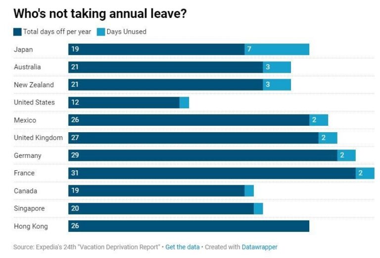 Για παράδειγμα, σχεδόν ένας στους τρεις εργαζόμενους στην Ιαπωνία παίρνει άδεια κάθε μήνα, σε σύγκριση με μόλις 5% των Αμερικανών και των Ευρωπαίων που παίρνουν άδεια συνήθω δύο φορές το χρόνο.