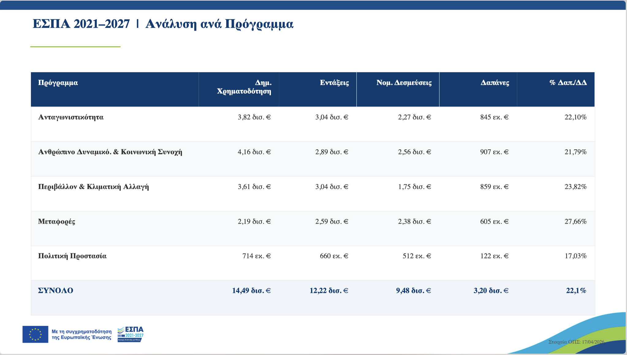 Πράσινη μετάβαση και περιβάλλον: Πάνω από 5,7 δισ. ευρώ κατευθύνονται στο πρόγραμμα «Περιβάλλον και Κλιματική Αλλαγή», καθιστώντας το έναν από τους μεγαλύτερους πυλώνες χρηματοδότησης.