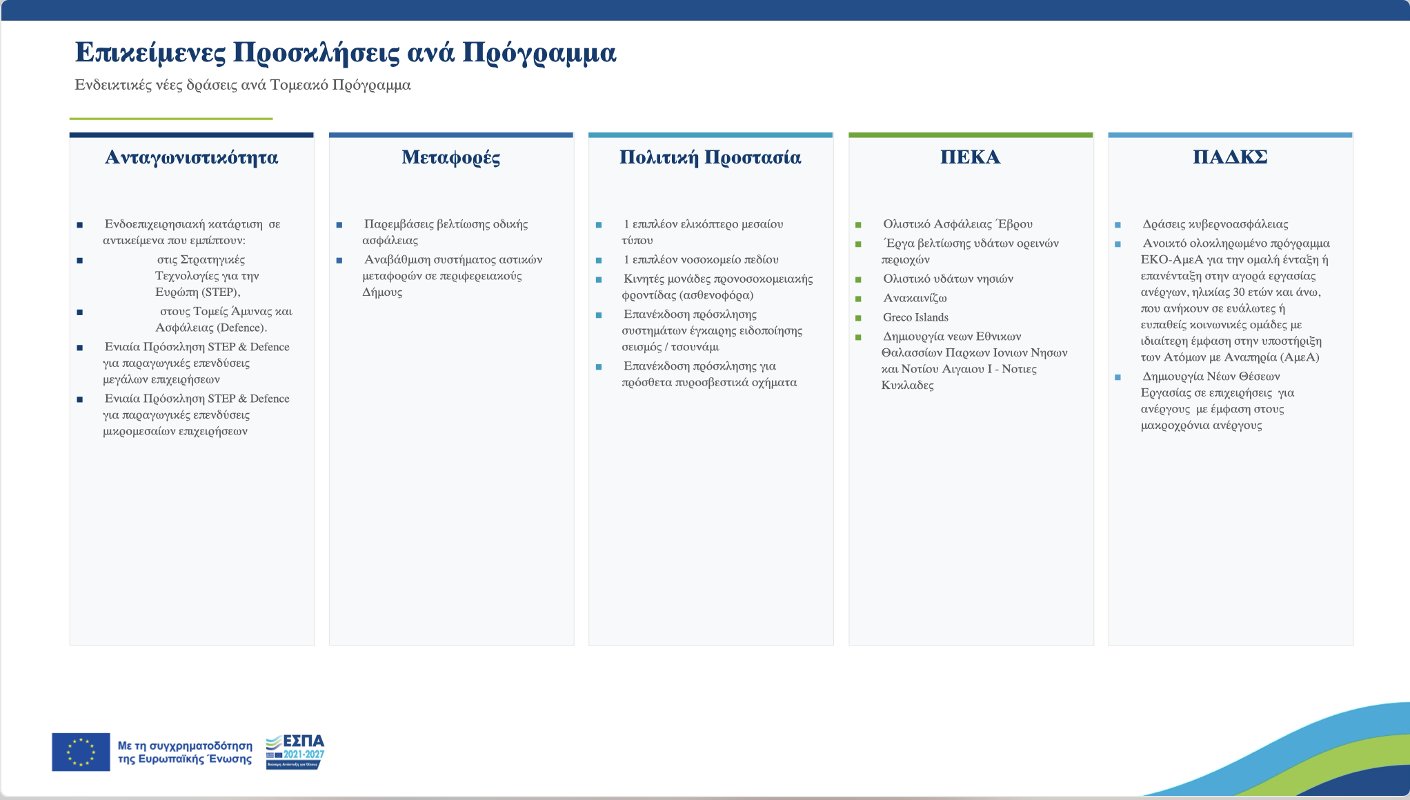 Επιχειρηματικότητα και καινοτομία: Η αιχμή του δόρατος του νέου ΕΣΠΑ είναι το πρόγραμμα «Ανταγωνιστικότητα», με συνολικούς πόρους που φτάνουν τα 4,6 δισ. ευρώ. Στόχος είναι η στήριξη της υγιούς επιχειρηματικότητας και η μετάβαση σε ένα νέο παραγωγικό μοντέλο, με έμφαση: