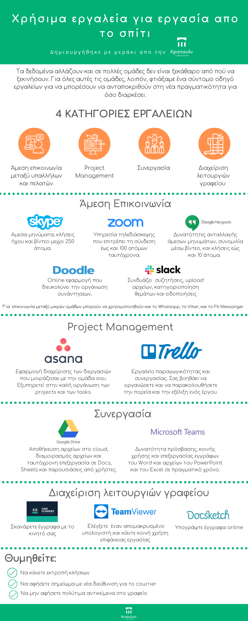 Ενώ οι πολυεθνικές έχουν τα συστήματα και την κουλτούρα να προσαρμοστούν πιο εύκολα και γρήγορα είναι λογικό οι μικρομεσαίες επιχειρήσεις να αντιμετωπίζουν δυσκολίες και να μην ξέρουν από πού να πρωτο ξεκινήσουν. Για όλες αυτές τις ομάδες λοιπόν, μικρές ή μεγάλες, φτιάξαμε έναν σύντομο οδηγό online εργαλείων για να μπορέσουν να ανταποκριθούν σε αυτή τη νέα πραγματικότητα για όσο αυτή διαρκέσει.