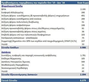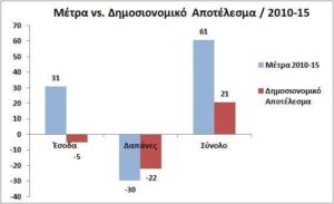 Παρατηρούμε πως παρότι έχουν παρθεί φορολογικά μέτρα ύψους €31 δισ. από το 2010 μέχρι και το 2015, τα έσοδα όχι μόνο δεν αυξήθηκαν, αλλά επιπλέον έχουν μειωθεί κατά €5 δισ. (-11%) σε σχέση με το 2009.