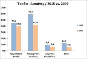 Το παρακάτω γράφημα εμφανίζει τη σύγκριση των εσόδων του 2009 με του 2015, όπως και των αντίστοιχων δαπανών.