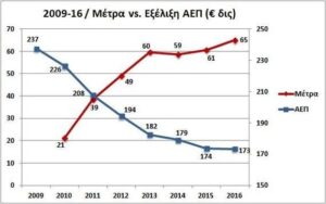 Συνέπεια αυτής της άνευ προηγουμένου δημοσιονομικής προσαρμογής ύψους €61 δισ. από το 2010 έως το τέλος του 2015 και συνολικά €65 δισ. συμπεριλαμβανομένου των νέων μέτρων του 2016, είναι το εισόδημα της χώρας (ΑΕΠ) να συρρικνωθεί κατά €64 δισ. = -27%, από €237 δισ. το 2009 σε €173 δισ. το 2016. Για κάθε €1 δισ. μέτρων χάνουμε €1 δισ. εισοδήματος. Η σχέση δηλαδή των περίφημων πολλαπλασιαστών είναι 1:1, αντί για 0,5:1 που προέβλεπε το ΔΝΤ.