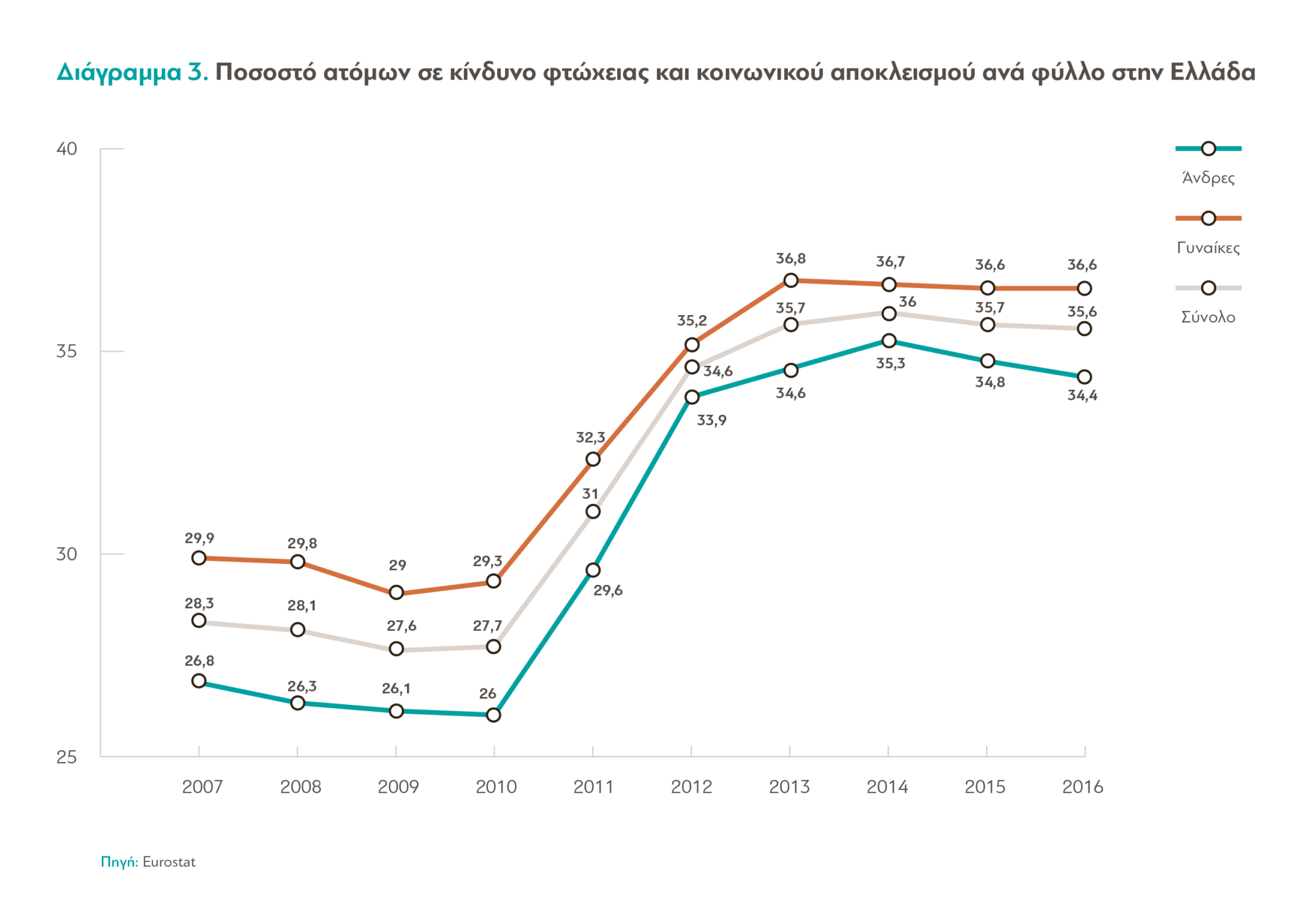 Το Διάγραμμα 3 απεικονίζει το ποσοστό ατόμων σε κίνδυνο φτώχειας ή κοινωνικού αποκλεισμού κατά την περίοδο 2007-2016. Η αύξηση του ποσοστού είναι της τάξης των 8 ποσοστιαίων μονάδων, η οποία πρακτικά σημαίνει αυξημένο κίνδυνο φτωχοποίησης ή αποκλεισμού ενός πολύ σημαντικού πληθυσμιακού ποσοστού (περίπου 700.000 ατόμων), το οποίο στην περίοδο πριν την κρίση λογιζόταν ως μεσαία τάξη. Μάλιστα, όπως φαίνεται στο ίδιο διάγραμμα, η αύξηση αυτή είναι εφάμιλλη για άνδρες και γυναίκες.