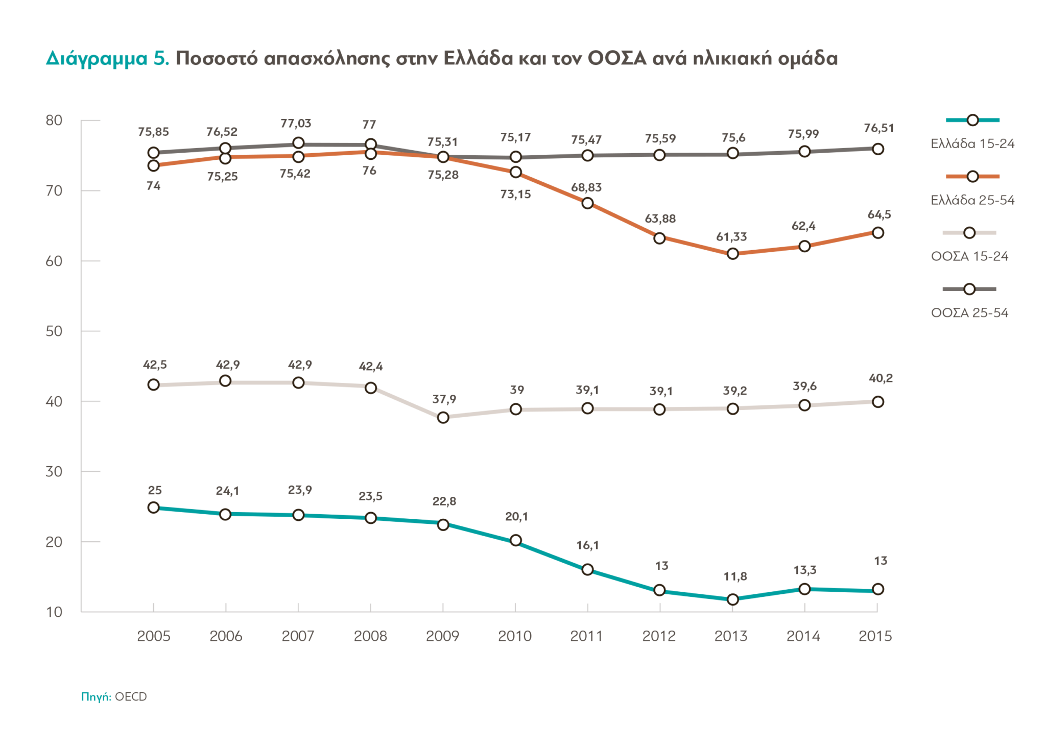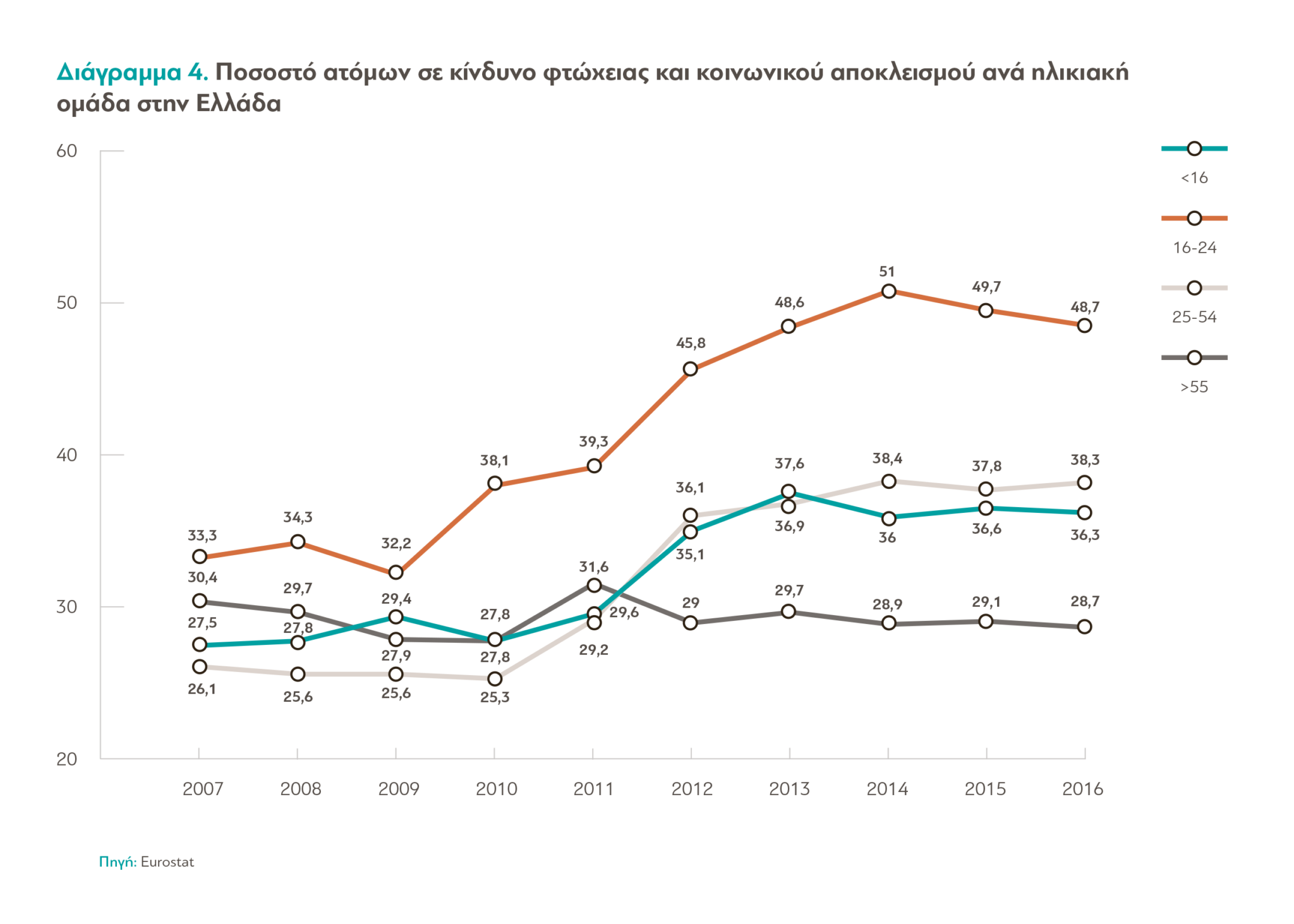 Ακόμα πιο εντυπωσιακά είναι τα συμπεράσματα που προκύπτουν όταν εξετάζεται το ποσοστό ατόμων σε κίνδυνο φτώχειας και κοινωνικού αποκλεισμού ανά ηλικιακή ομάδα. Όπως φαίνεται στο Διάγραμμα 4, η μόνη ηλικιακή ομάδα για την οποία δεν παρατηρείται αύξηση είναι αυτή των 55 ετών και άνω, που κυρίως περιλαμβάνει συνταξιούχους. Αντίθετα, αυξάνεται τόσο ο κίνδυνος παιδικής φτώχειας και κοινωνικού αποκλεισμού, όσο και ο αντίστοιχος κίνδυνος για τις παραγωγικές ηλικίες. Τεράστια είναι η αύξηση του κινδύνου για τους νέους 16-24 ετών.
