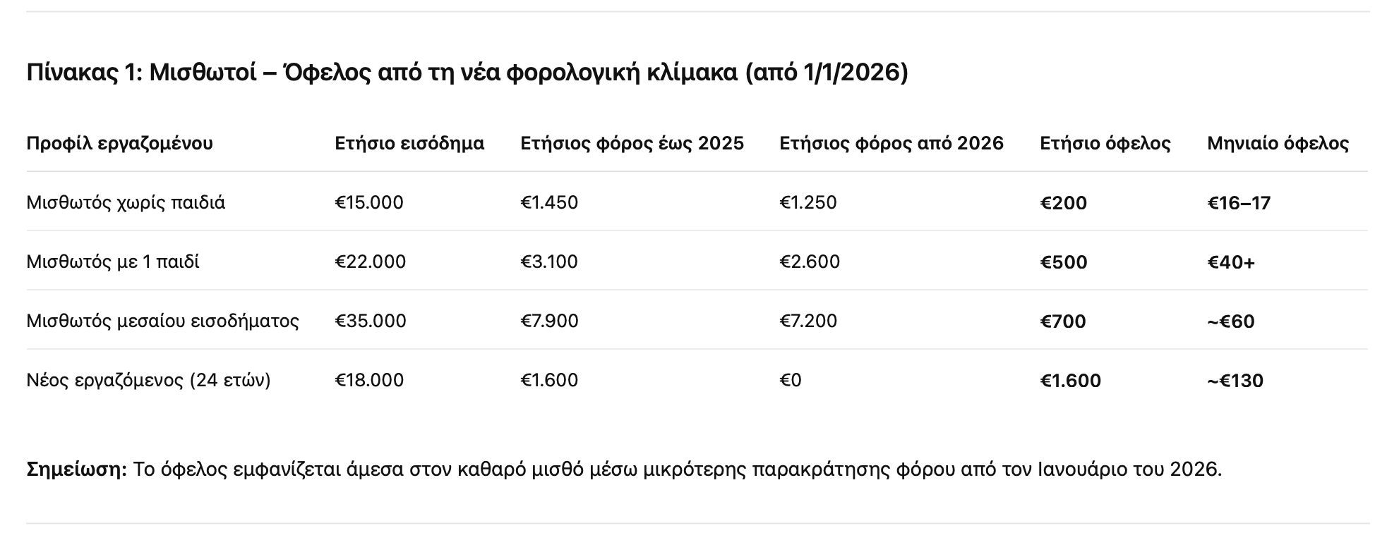 - Από 1 Ιανουαρίου 2026, το βασικό αποτέλεσμα για τους μισθωτούς (ιδιωτικού και δημόσιου τομέα) είναι ότι θα βλέπουν αυξημένες καθαρές αποδοχές λόγω μικρότερης παρακράτησης που προκύπτει από τη νέα φορολογική κλίμακα. Μεταξύ άλλων προβλέπεται: