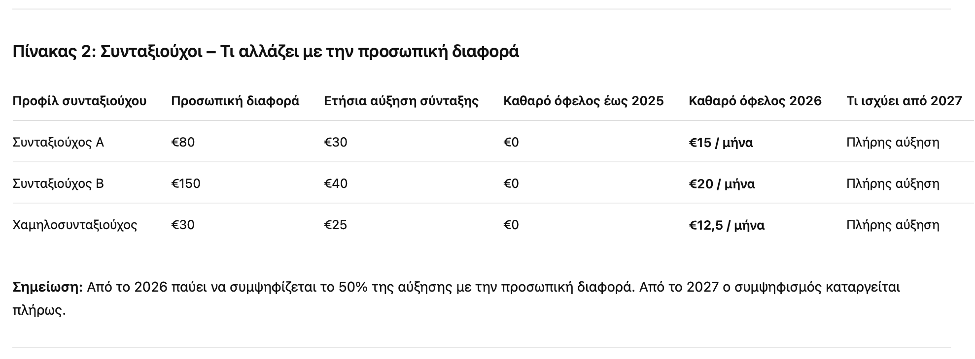 - Από Ιανουάριο 2026: δεν θα συμψηφίζεται το 50% της αύξησης της σύνταξης με την προσωπική διαφορά.