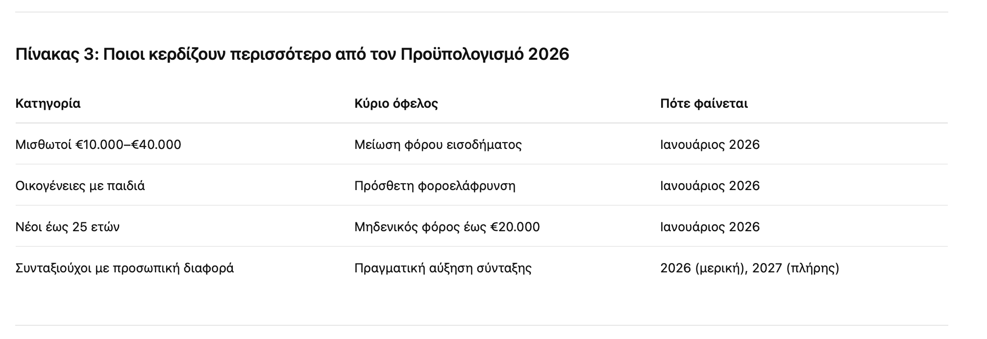 - Περαιτέρω ελάφρυνση για οικογένειες με παιδιά, ειδικά για το κομμάτι εισοδήματος €10.000–€20.000, με ισχυρότερη στόχευση στις πολύτεκνες οικογένειες.