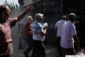 Ένταση επικράτησε μπροστά από την Ηρώδου Αττικού όπου κατέληξε η πορεία των συνταξιούχων, με στόχο αντιπροσωπεία τους να συναντήσει τον πρωθυπουργό στο Μέγαρο Μαξίμου, με την αστυνομία να απαντά με… χημικά εναντίον των ηλικιωμένων. ι συνταξιούχοι επιχείρησαν να περάσουν από τη διασταύρωση της Ηρώδου Αττικού με τη Βασιλίσσης Σοφίας προσπαθώντας ταυτόχρονα να ρίξουν, ωθώντας μία κλούβα η οποία ήταν παραταγμένη, με αποτέλεσμα οι δυνάμεις των ΜΑΤ που βρίσκονταν εκεί να απαντήσουν με ρίψη χημικών για να διαλυθεί το πλήθος. Να σημειώσουμε ότι ο αστυνομικός ο οποίος έκανε χρήση χημικών εντοπίστηκε, ύστερα από την εντολή γιαδιενέργεια προκαταρκτικής εξέτασης από τη ΓΑΔΑ.