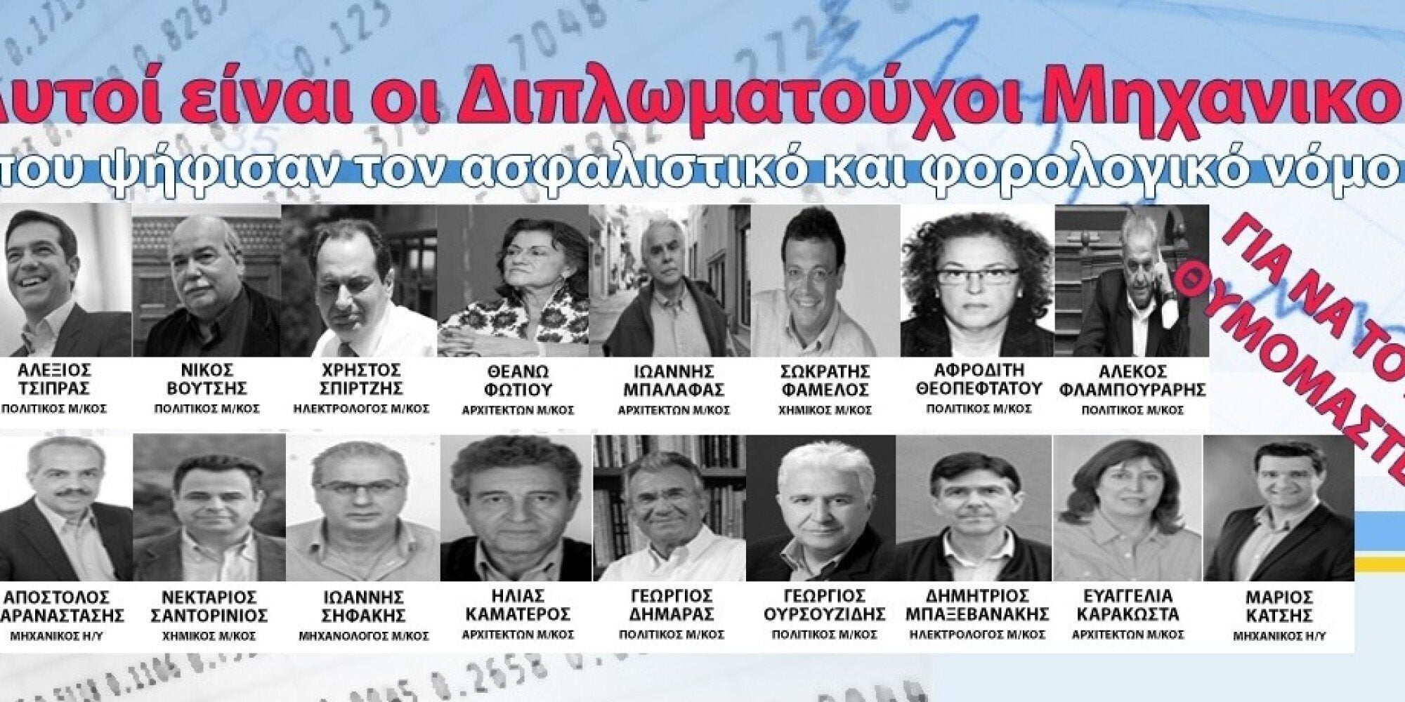 Ονομαστικά και με τη φωτογραφία ανακοίνωσε το ΤΕΕ τα ονόματα των διπλωματούχων μηχανικών που ψήφισαν τον ασφαλιστικό και φορολογικό νόμο, σε δελτίο τύπου στο οποίο αναφέρει χαρακτηριστικά «Για να τους θυμόμαστε».
