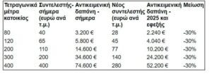 - κατά 30% για κατοικίες σε περιοχές με Τιμή Ζώνης κάτω από 2.800 ευρώ ανά τετραγωνικό. Για σπίτια έως 80 τ.μ., ο συντελεστής μειώνεται από 40 σε 28 ευρώ ανά τ.μ. και η αντίστοιχη μείωση της αντικειμενικής δαπάνης από 3.200 ευρώ σε 2.240 ευρώ (-30%). Ενώ για κατοικίες 120 τ.μ., η αντικειμενική δαπάνη μειώνεται από 5.800 σε 4.040 ευρώ.