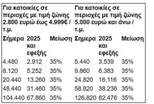 - για κατοικίες σε περιοχές με τιμές ζώνης από 2.800 έως 4.999 ευρώ/τ.μ. το τεκμαρτό θα προσαυξάνεται πλέον κατά 30% και όχι κατά 40%. Έτσι η αντικειμενική δαπάνη μειώνεται συνολικά κατά 35%