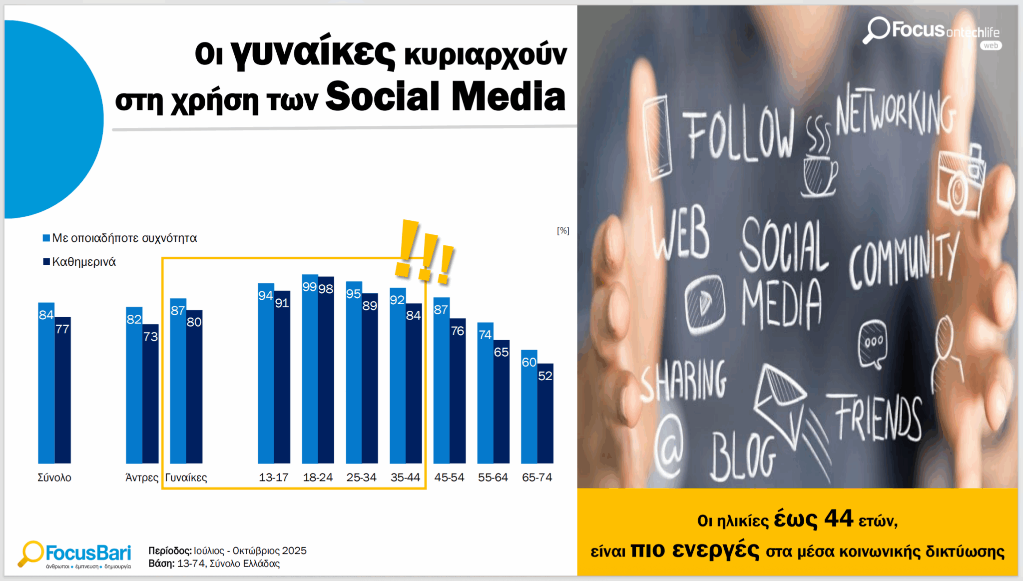 Ένα από τα πιο ενδιαφέροντα ευρήματα της έρευνας είναι η κυριαρχία των γυναικών στα μέσα κοινωνικής δικτύωσης. Το 87% των γυναικών χρησιμοποιεί social media με οποιαδήποτε συχνότητα, έναντι 82% των ανδρών. Η διαφορά γίνεται ακόμη πιο έντονη στην καθημερινή χρήση, όπου οι γυναίκες προηγούνται με 80% έναντι 73%.