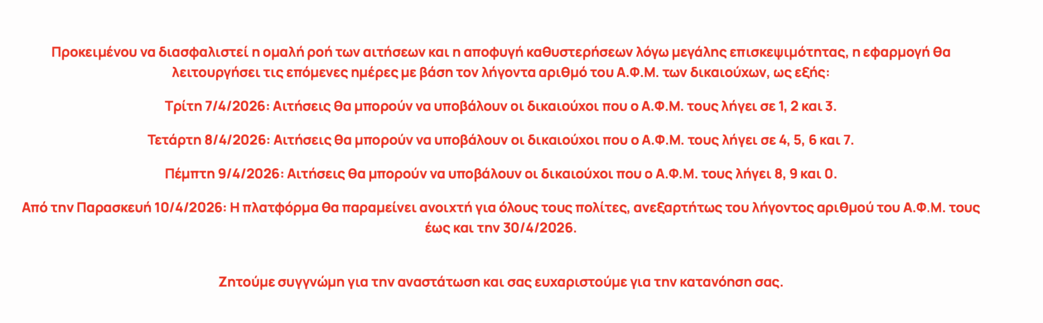 Μπροστά στην «αποσύνθεση» του αρχικού σχεδιασμού, η λύση που επανήλθε άμεσα στο τραπέζι –και τελικά προκρίθηκε ως η πιο ορθολογική– ήταν η σταδιακή πρόσβαση των δικαιούχων με βάση το τελευταίο ψηφίο του ΑΦΜ τους. (Διάβασε ΕΔΩ αναλυτικά).