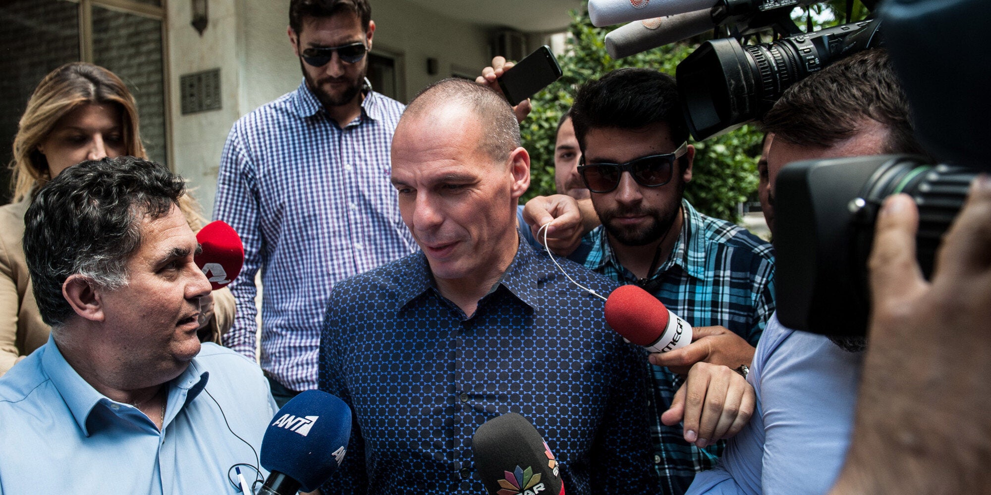 Outgoing Greek Finance Minister Yanis Varoufakis is surrounded by media as he leaves from his house in Athens, Monday, July 6, 2015. Varoufakis resigned Monday, saying he was told shortly after Greece's decisive referendum result that some other eurozone finance ministers and the country's other creditors would appreciate his not attending the ministers' meetings. (Giorgos Bampoukos/InTime News via AP) GREECE OUT