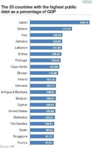 Υπενθυμίζουμε ότι τον Ιούλιο του 2015 η Ελλάδα βρισκόταν επίσης στην δεύτερη θέση, όμως το χρέος ήταν μικρότερο (172,3% του ΑΕΠ) και της Ιαπωνίας μικρότερο (246,14) του ΑΕΠ.