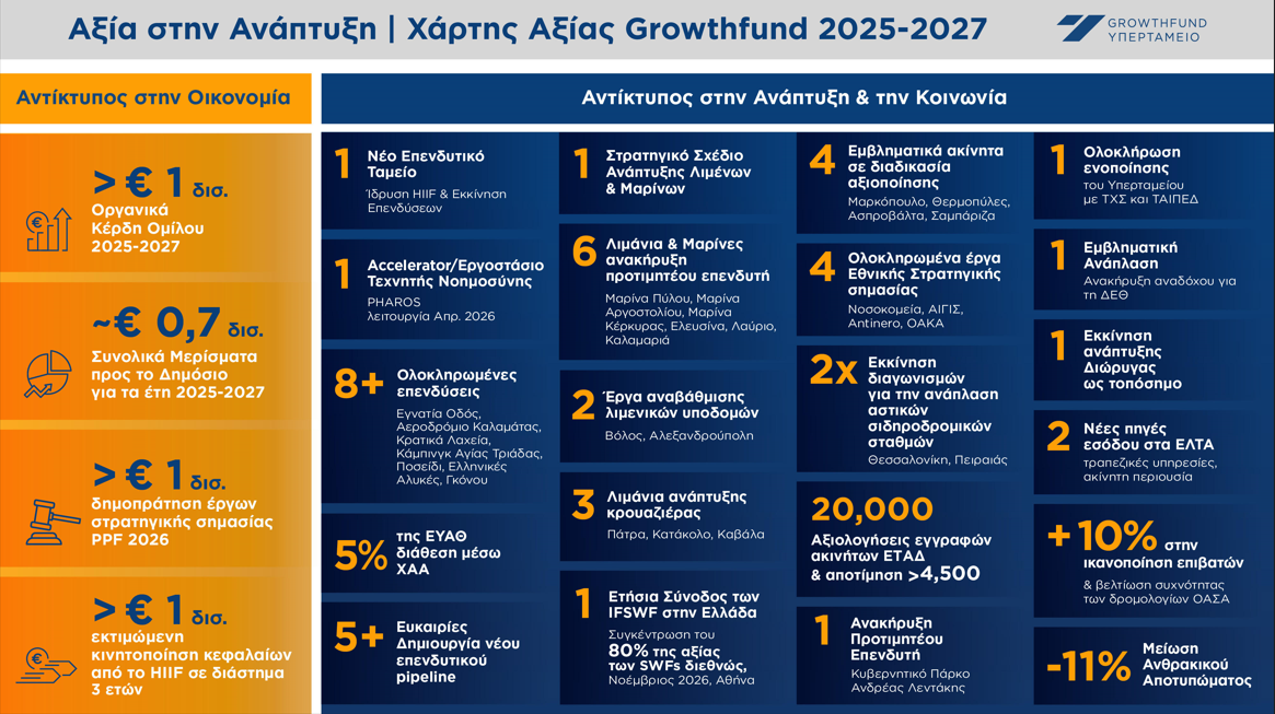 «Ενισχύουμε τον επενδυτικό μας ρόλο, κινητοποιούμε κεφάλαια και τεχνογνωσία και δημιουργούμε ένα ολοκληρωμένο οικοσύστημα που συνδυάζει μετασχηματισμό, επενδύσεις και επιτάχυνση έργων με απτά αποτελέσματα για την οικονομία και τους πολίτες» τόνισε.