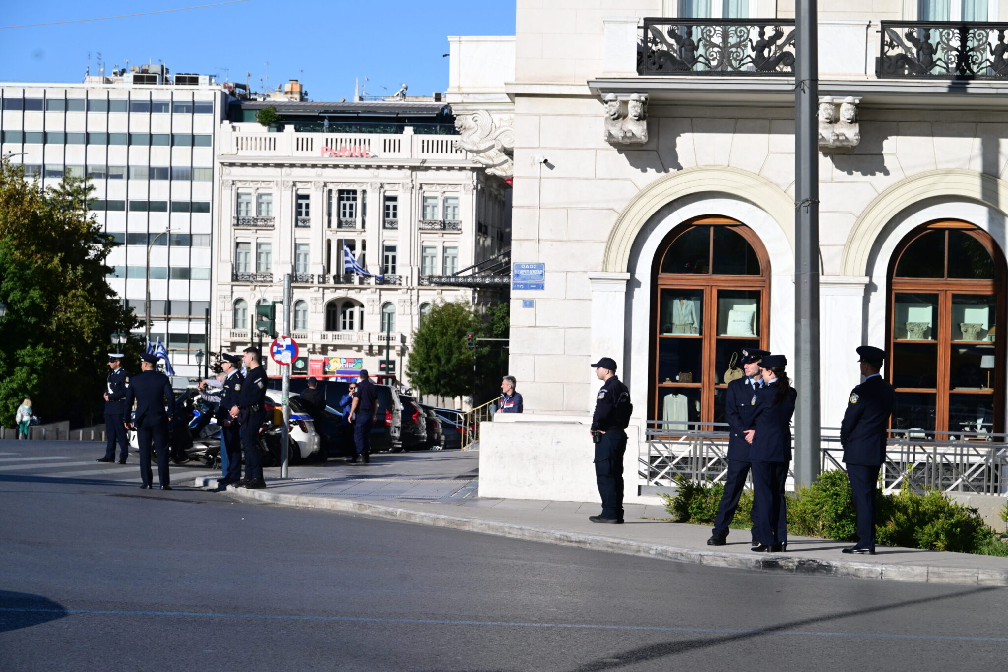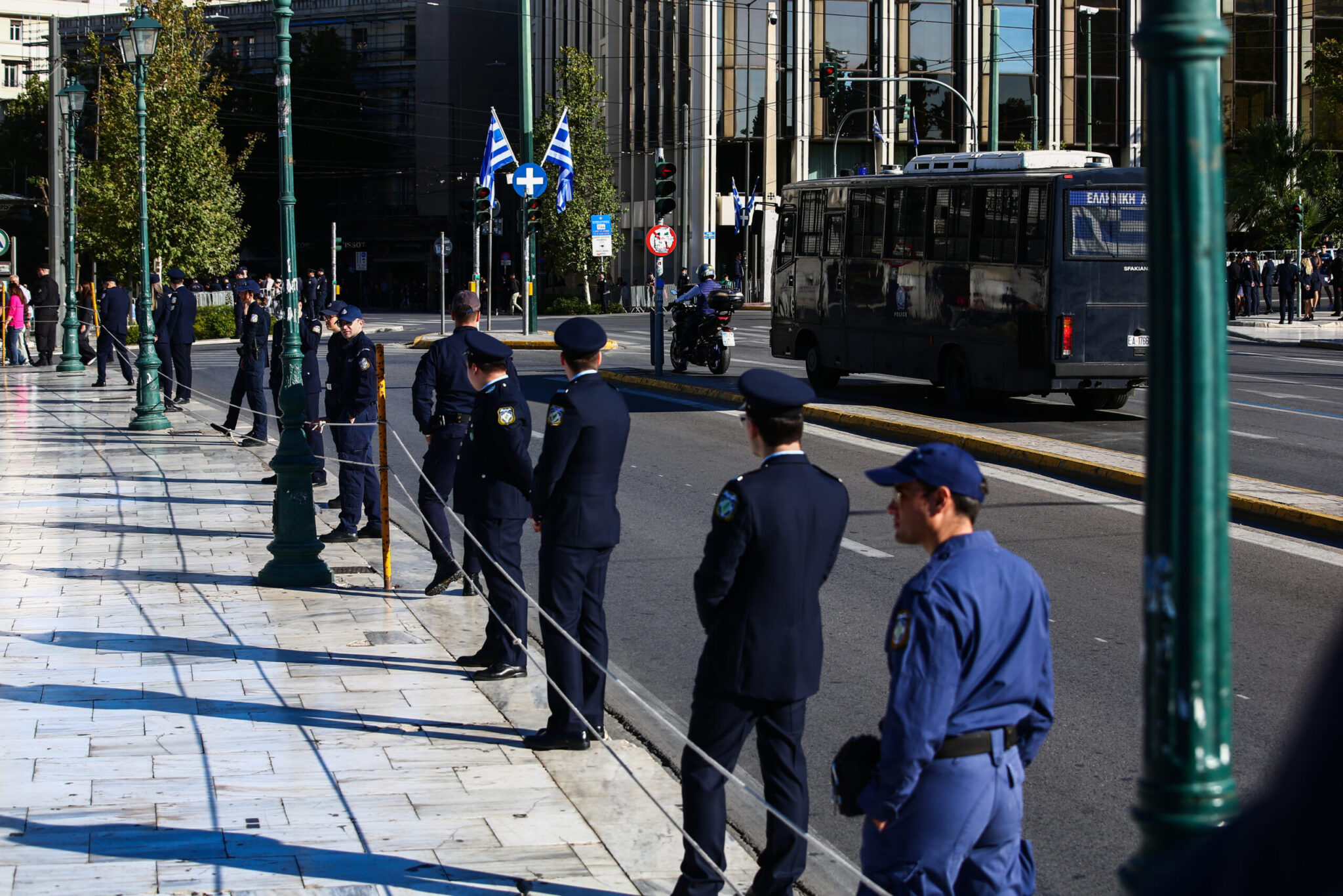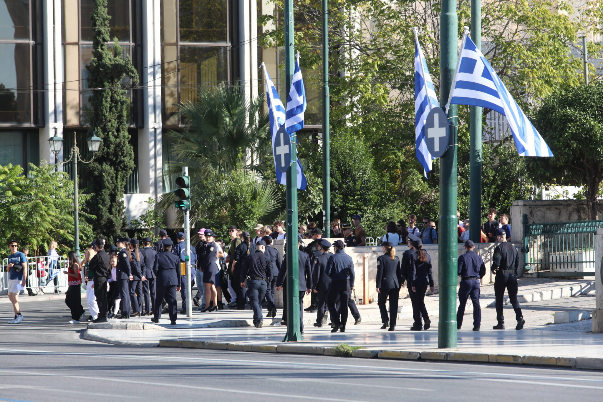 Ισχυρή είναι η αστυνομική παρουσία στο κέντρο της Αθήνας από νωρίς το πρωί της 28ης Οκτωβρίου ενόψει της μαθητικής παρέλασης στις 11:00 στην πλατεία Συντάγματος.