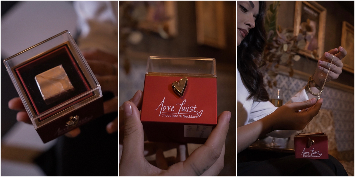 Το LOVE TWIST είναι φτιαγμένο ακριβώς γι’ αυτό: ένα κουτί που στρέφεται και κρύβει μέσα του δύο δώρα σε ένα. Πρώτα, ένα σοκολατάκι για τη γλύκα της στιγμής. Και μετά, η πραγματική έκπληξη: ένα επιχρυσωμένο κολιέ, ένα κόσμημα που μπορεί να φοριέται κάθε μέρα σαν μικρή υπόσχεση, σαν σιωπηλό «σε σκέφτομαι περισσότερο απ’ όσο νομίζεις».