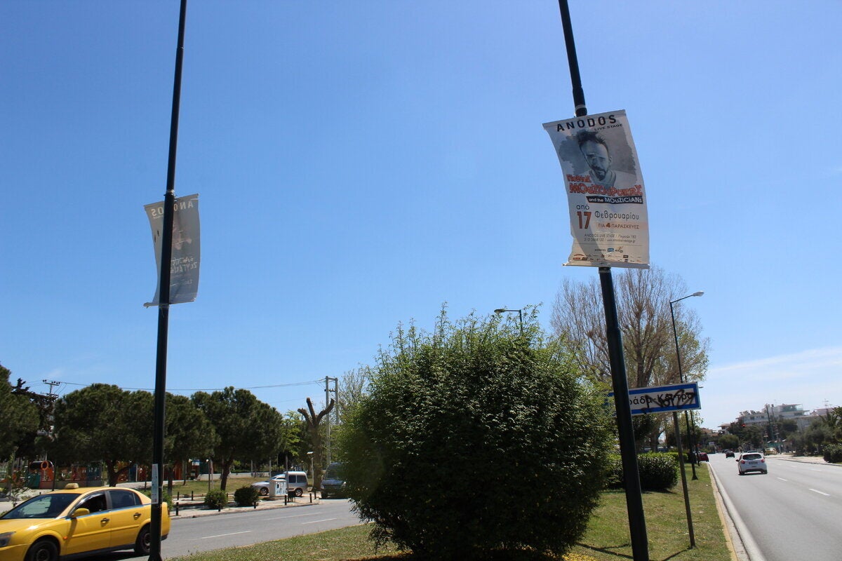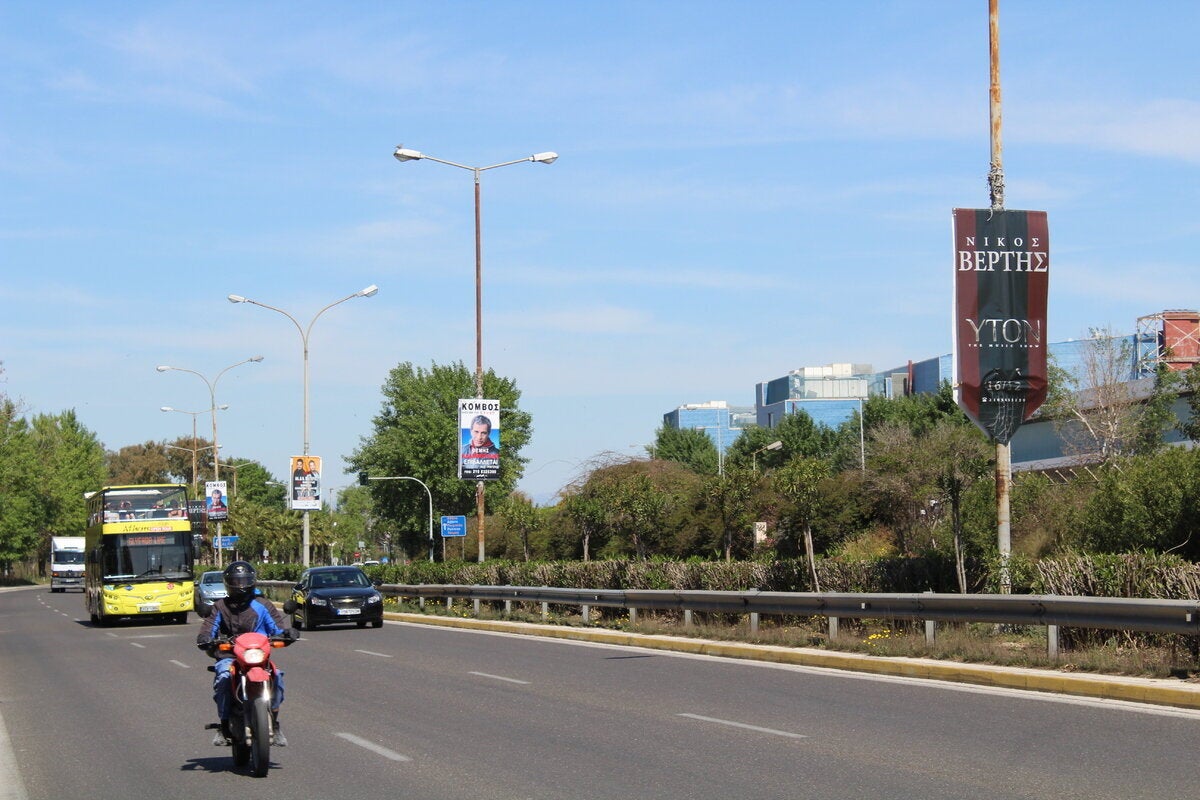 «Τα πεζοδρόμια εκατέρωθεν της λεωφόρου εμπίπτουν στην αρμοδιότητα του Δήμου, ενώ για τη διαχωριστική νησίδα υπεύθυνη είναι η Περιφέρεια. Η ευθύνη λοιπόν, τυπικά είναι της Περιφέρειας αλλά επειδή κάποιες φορές υπάρχει πλημμέλεια στη συντήρηση, παρεμβαίνουμε σαν Δήμος. Ο πολίτης δεν ξέρει ότι είναι ευθύνη της Περιφέρειας και κατηγορεί εμάς. Προσπαθούμε να κατεβάζουμε συνεχώς τις αφίσες με συνεργεία και γερανοφόρο όχημα γιατί συνήθως είναι ψηλά τοποθετημένες. Όμως, επανέρχονται… Αυτό σημαίνει χαμένες εργατοώρες, άρα και κόστος για τους δημότες που προκαλείται από μια παράνομη δραστηριότητα. Επανειλημμένως έχουμε επιβάλλει πρόστιμα γιατί το θεωρούμε σημαντικό ζήτημα τόσο για την οδική ασφάλεια όσο και για την αισθητική της πόλης μας. Κάντε ρεπορτάζ σε λίγες μέρες και θα δείτε ότι θα έχουν κατέβει, αλλά πιθανώς να έχουν βάλει άλλες, παρακαλώ ελέγξτε το».