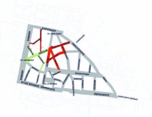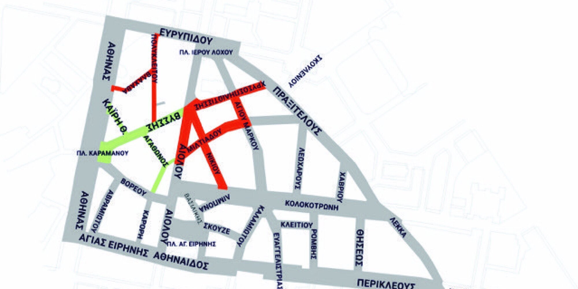 Ειδικότερα ο δήμος Αθηναίων, στο πλαίσιο της αποκατάστασης του Εμπορικού Τριγώνου της Αθήνας και της ανάδειξής του σε τρίγωνο – πρότυπο, ολοκληρώνει την πρώτο φάση πεζοδρομήσεων, αποδίδοντας από την ερχόμενη Πέμπτη στους πεζούς τέσσερις ακόμη δρόμους: τις οδούς Χρυσοσπηλιωτίσσης, Νικίου, Πολυκλείτου και Βλαχάβα (σκιασμένοι με κόκκινο χρώμα στον χάρτη).