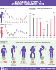 Η ΕΛΣΤΑΤ καταγράφει 6.134 δηλωθέντα κρούσματα λοιμωδών νοσημάτων το 2024, έναντι 4.177 το 2023, σημειώνοντας εκρηκτική αύξηση 46,9% σε διάστημα μόλις ενός έτους.