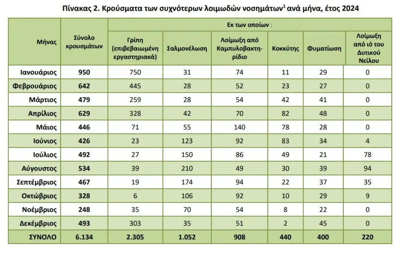 Η γρίπη αποτέλεσε τη συχνότερη λοίμωξη του 2024, με 2.305 εργαστηριακά επιβεβαιωμένα περιστατικά, σχεδόν διπλάσια από τα 1.192 του 2023 (+93,4%). Η δραστηριότητα της νόσου κορυφώθηκε τον Φεβρουάριο και υποχώρησε την άνοιξη, ακολουθώντας την αναμενόμενη εποχικότητα.
