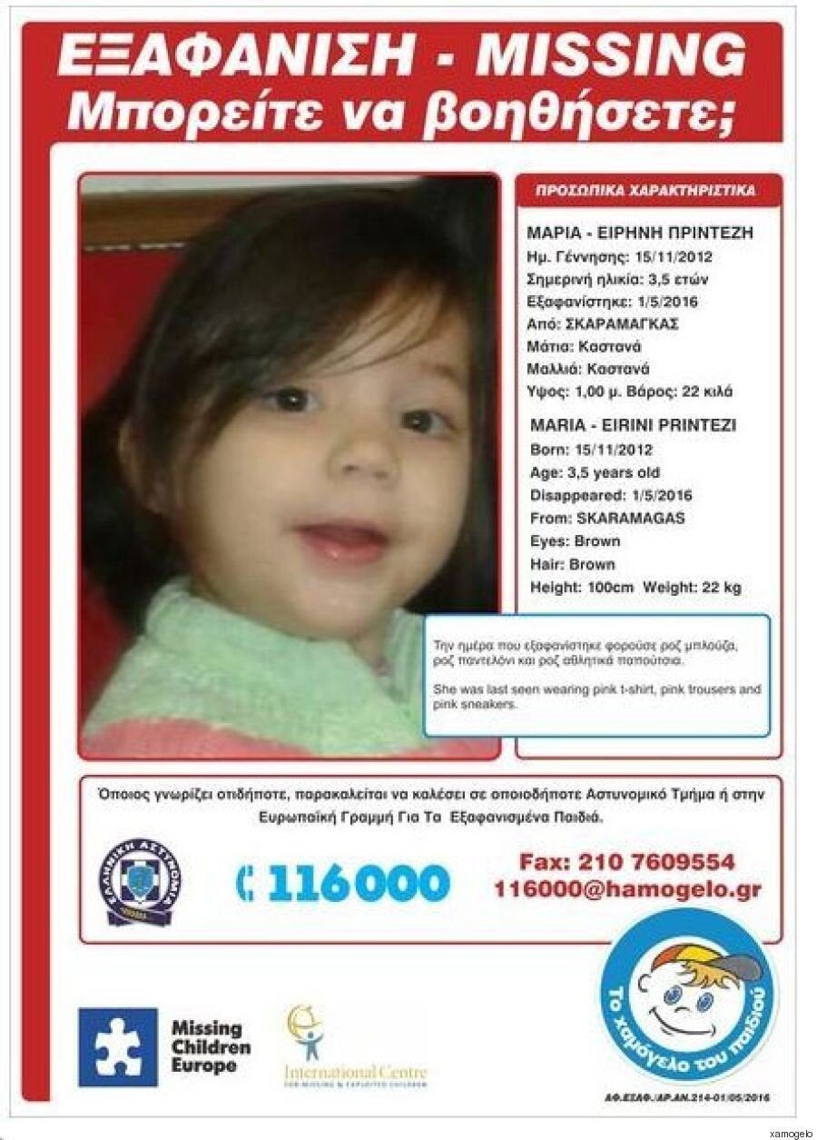 «Η Μαρία- Ειρήνη Πρίντεζη, 3,5 ετών εξαφανίστηκε στις 14.40 το μεσημέρι. Η Μαρία- Ειρήνη έχει καστανά μακριά μαλλιά, καστανά μάτια, έχει ύψος 1,00 μέτρο και ζυγίζει 22 κιλά. Φορούσε ροζ μπλούζα, ροζ παντελόνι και ροζ αθλητικά παπούτσια. Λόγω της μικρής ηλικίας του παιδιού και των συνθηκών εξαφάνισης υπάρχουν ενδείξεις ότι το παιδί κινδυνεύει».