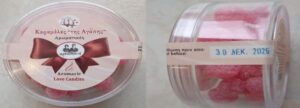 Καραμέλες «της Αγάπης-Αρωματικές» με ημερομηνία ανάλωσης πριν από τις 30 ΔΕΚ. 2026, συσκευασίας καθαρού βάρους περίπου 110g της εταιρείας με διακριτικό τίτλο «αρκαδιανή» που εδρεύει στο Ψάρι Αρκαδίας.