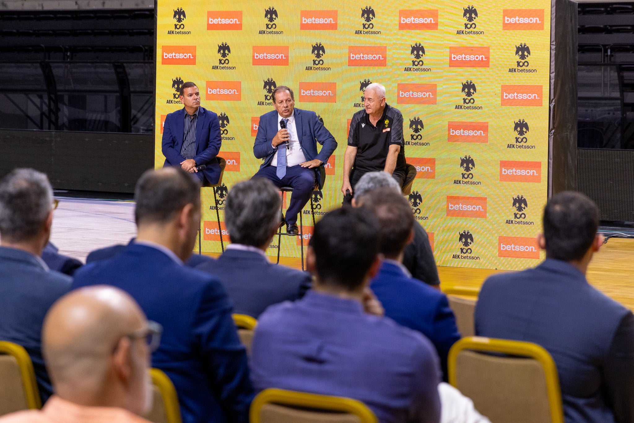 Στη Συνέντευξη Τύπου έδωσαν «το παρών» ο μεγαλομέτοχος της AEK Betsson BC, Μάκης Αγγελόπουλος, ο Μanaging Director της Betsson Greece, Θάνος Μαρίνος και ο προπονητής της ομάδας, Ντράγκαν Σάκοτα.