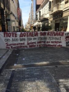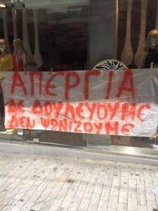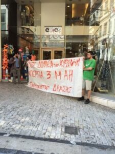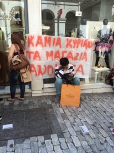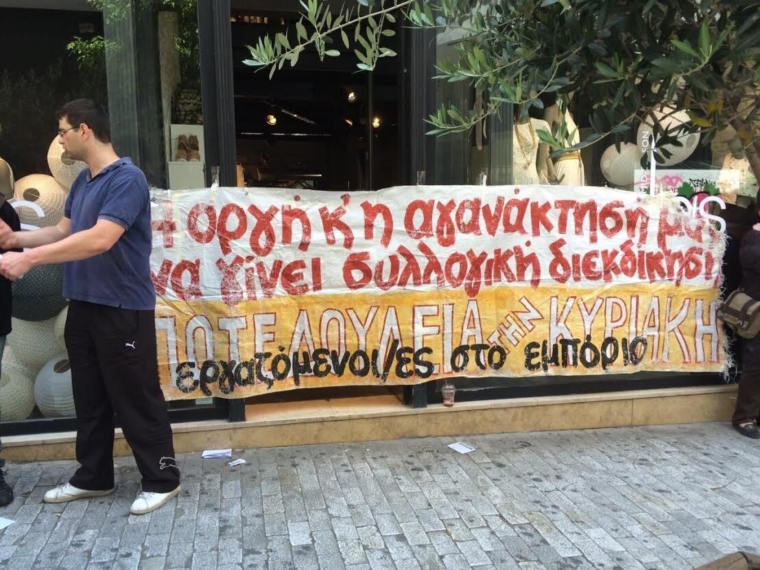 Την ίδια ώρα οι εργαζόμενοι, ανά δεκάδες σε σημεία κατά μήκος της Ερμού, του εμπορικότερου δρόμου της πρωτεύουσας, με πανό και συνθήματα, διαδήλωναν ενάντια στη λειτουργία των καταστημάτων τις Κυριακές, ανταποκρινόμενοι στο κάλεσμα της ΟΙΥΕ.