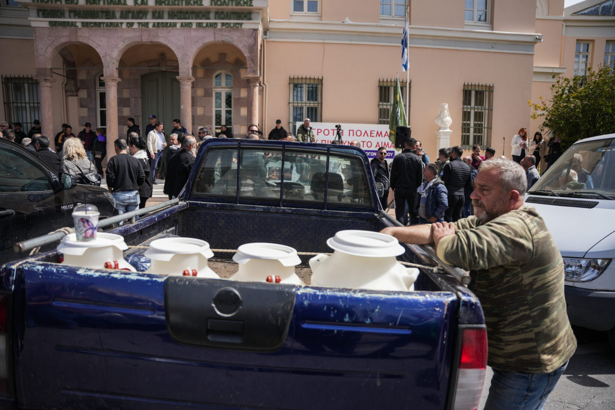 Την Τρίτη, η αρχική συγκέντρωση των κτηνοτρόφων έγινε έξω από τη Γενική Γραμματεία Αιγαίου και Νησιωτικής Πολιτικής, όπου οι διαδηλωτές πέταξαν ζωοτροφές.
