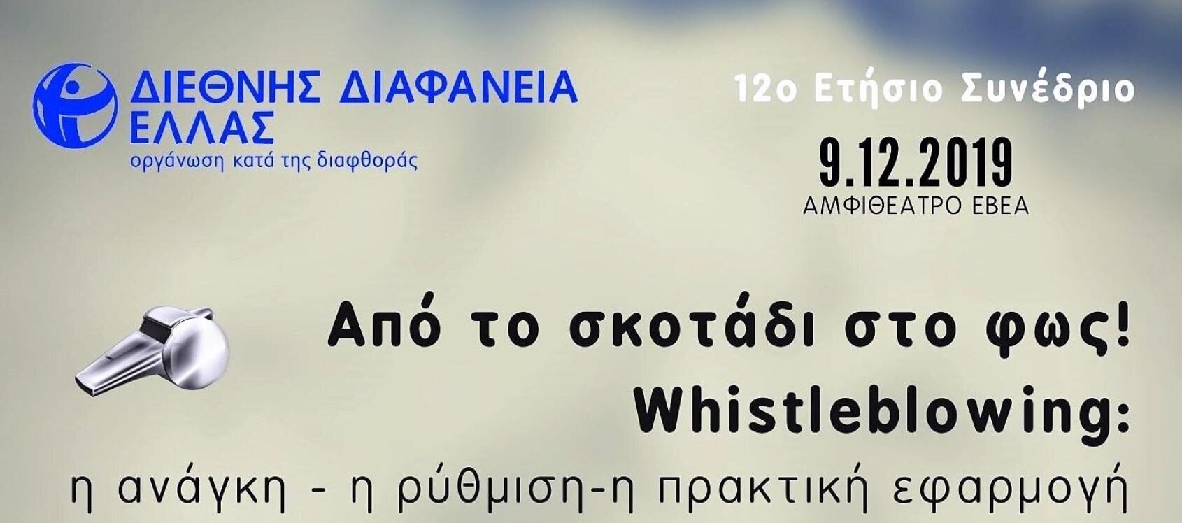 «Από το σκοτάδι στο φως! Whistleblowing: η ανάγκη – η ρύθμιση – η πρακτική εφαρμογή» είναι ο τίτλος του 12ου Ετήσιου Συνεδρίου που διοργανώνει η Διεθνής Διαφάνεια Ελλάς τη Δευτέρα 9 Δεκεμβρίου 2019 και ώρα 10:00 π.μ., στο Εμπορικό και Βιομηχανικό Επιμελητήριο Αθηνών (Ακαδημίας 7, Αθήνα).