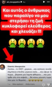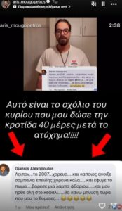 «Νομίζω ότι αναφέρεται σε μένα επειδή κινήθηκα νομικά απέναντι του. Ελπίζω να υπάρχει Θεός αν και πρόλαβε και διέγραψε το σχόλιο γιατί το προφίλ του στο instagram ήταν ”Γιάννης ο ασύλληπτος”. Όπως εξαπάτησε και μένα, εξαπάτησε και όλους τους φίλους και γνωστούς ότι θα ερχόταν να μου ζητήσει συγγνώμη. Μετά από 40 ημέρες έχει τα κότσια να κυκλοφορεί ελεύθερος και να γράφει κάτι τέτοιο. Δεν ήξερε, όμως, ότι το έξυπνο πουλί από τη μύτη πιάνεται» καταλήγει ο Άρης Μουγκοπέτρος.