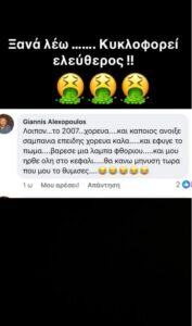 Στη συνέχεια, μάλιστα, έκανε και τρεις αναρτήσεις στα stories, επισημαίνοντας αρχικά ότι «αυτό είναι το σχόλιο του κυρίου που μου έδωσε την κροτίδα, 40 ημέρες μετά το ατύχημα», για να συμπληρώσει «αυτός ο άνθρωπος που παραλίγο να μου στερήσει τη ζωή κυκλοφορεί ελεύθερος και χλευάζει» και «ξαναλέω, κυκλοφορεί ελεύθερος».