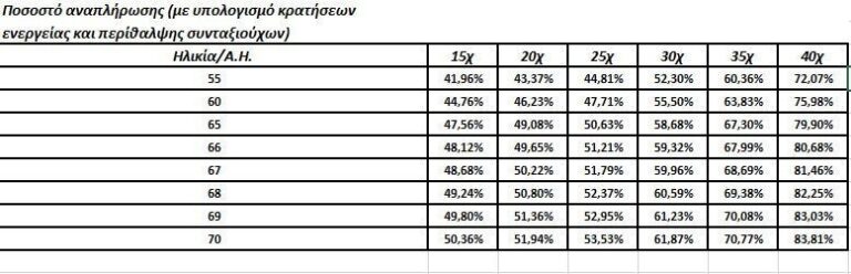 Ποσοστό αναπλήρωσης (με υπολογισμό κρατήσεων ενεργείας και περίθαλψης συνταξιούχων)
