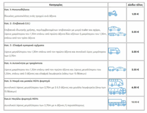 Κατηγορία 1 – Μοτοποδήλατα. Δίκυκλες μοτοσυκλέτες ενός τροχού ανά άξονα: 1,25 ευρώ.